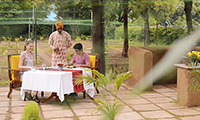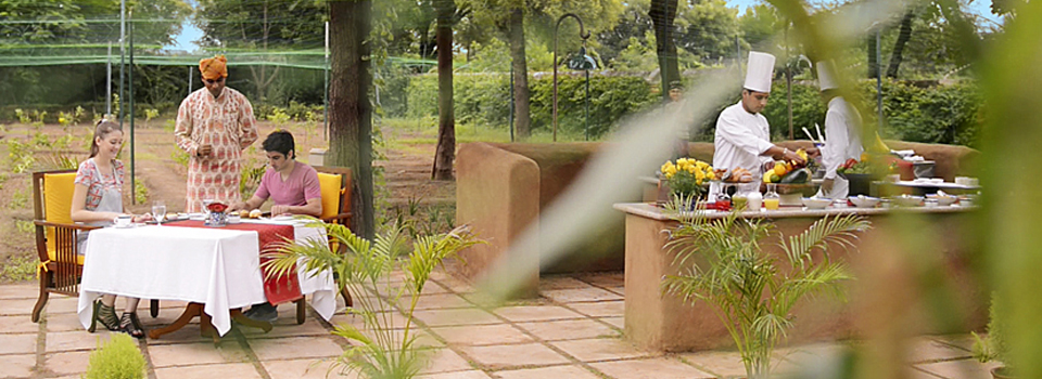 Indulge in a Rajasthani Thali meal overlooking the pool and an ancient haveli (mansion) on one side and the 280 year old Shiva temple on the other. Lit up with mashaals (gas torches) and charmingly decorated with earthen lamps and flowers, this is a magnificent setting.